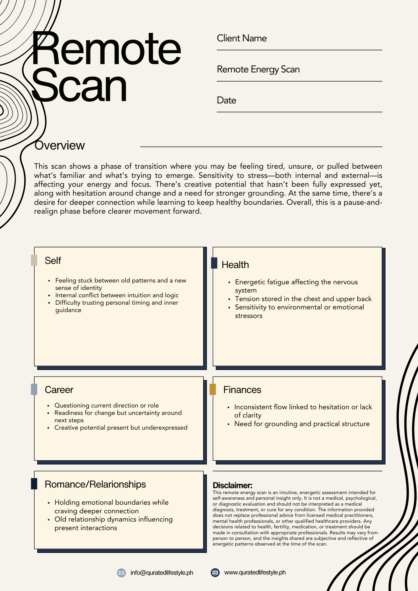 The Remote Energy Scan Report is a personalized intuitive reading that looks into your current energetic, emotional, and psycho-spiritual state. Through this scan, patterns affecting your self, health, work, finances, and relationships are gently identified—especially areas of imbalance, suppression, or transition. The report offers clarity on what may be influencing you beneath the surface, helping you understand what needs attention, release, or realignment. This is not predictive or diagnostic, but reflective—designed to support awareness, insight, and conscious choice in your healing and life journey.